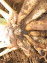 (4)も地植えジャンセア開花株を掘り上げたところ。この株には根圏に蟻が巣を作って住み着いていた。それで茎と根の境目付近が黒く変色している。この株の問題点は同時にわらじ虫の食害も見られる事である。茎と根の境目付近がやられている。これ以上食害が進むと、株が枯れてしまう。