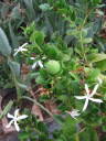 解説:(1)気温の低下で枝の伸びはゆっくりになりました。(2)夏場開花した後、結実した実は少しずつ大きくなっています。熟して収穫できるものもある。(3)また、今でも花は見られます。