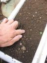 - (3)種子は一箇所一粒、合計二粒播くことにした。(4)間隔は30cm程度取り、(4)1~2cmの深さまで押し込むように蒔き、(5)土をかけて上から押さえて土と種子とを密着させた。