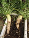 解説:(1)やはり春先の低温の影響で、薹立ちしてしまった。こうなると大根としての収穫は出来なくなる・・・残念!