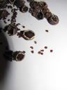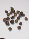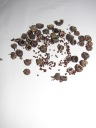 解説:(1)6月に収穫した種子は室内で乾燥させていました。(2)水分が抜けてだいぶ種子は小さくなりました。角張っていて、茶色から焦げ茶色の種子がたくさん取れた。