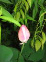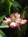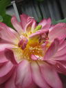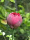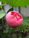 しばらく見ているとその蓮台の上にスポットライトが当たり、お釈迦様が舞い降りてきたかと錯覚させられる様な雰囲気を持つ。写真を撮ってから気が付いたことは、花の色が濃いことです。他に赤系の品種は多いが、開ききったときはほとんど薄いピンク色に変わってしまう。それがこの花は濃い色を呈していて、自分自身でも驚いた。※写真に補正はありません。