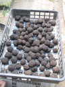 (4)は現在使用している肥料で、市販の粉状発酵鶏糞を丸めたもの。作り方は適当な容器に鶏糞を入れて水を少しずつ入れながら混ぜる。鶏糞全体に水が行き渡って整形出来る様になったら、ゴルフボール大に丸めてトレーに入れて乾燥させる。