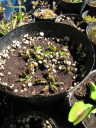 (4)実生苗の方も順調ですが、大きくなるのに時間が掛かっています。捕虫葉は出ていますが、まだギンバエを捕らえるほどではありません。ちなみに白い粒はパーライトで、水やりで減った用土を増し土したものです。