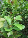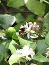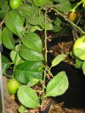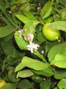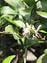 (6)は結果枝の節に花を付けたもの。(左側の果実を付けた枝)この枝右側には他に緑色の極小さい果実と、まだ収穫には早い中くらいの果実が付いている。極小さい果実は、昨年秋に開花、結実したもの。中くらいの果実は同じく夏に開花、結実したもの。左右の果実は大きさが異なるのは結実した時期の差による。