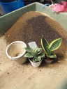 解説:(1)はネット通販で購入した「スパーバ」と「シルバーハニー」です。植え替える鉢は5号プラ鉢です。用土は赤田土小粒と鹿沼土の等量混合に、完熟堆肥を1割くらい混合したものです。