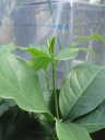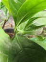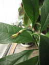 (3)昨冬室内に取り込んだときは気が付かなかったのですが、害虫にやられました。葉が重なっていた所に小さなイモムシがいて、葉を食べていました。無農薬栽培なので仕方がないと言えば仕方がない。