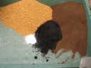 写真左上は鹿沼土。同じく右は小粒赤玉土系。中心の黒い箇所は完熟堆肥。白色のものは苦土石灰。それぞれの比は鹿沼土と赤玉土が1:1でその全体の1~2割位の完熟堆肥、苦土石灰は少量です。