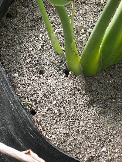 解説:(1)は鉢植えレギネー大苗に作った蟻の巣の地表の様子。地表から鉢土に複数の穴を掘って成虫が出入りしている。
