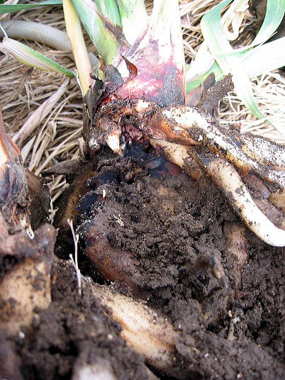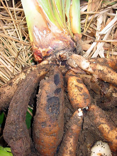 (4)も地植えジャンセア開花株を掘り上げたところ。この株には根圏に蟻が巣を作って住み着いていた。それで茎と根の境目付近が黒く変色している。この株の問題点は同時にわらじ虫の食害も見られる事である。茎と根の境目付近がやられている。これ以上食害が進むと、株が枯れてしまう。