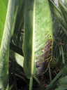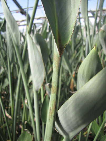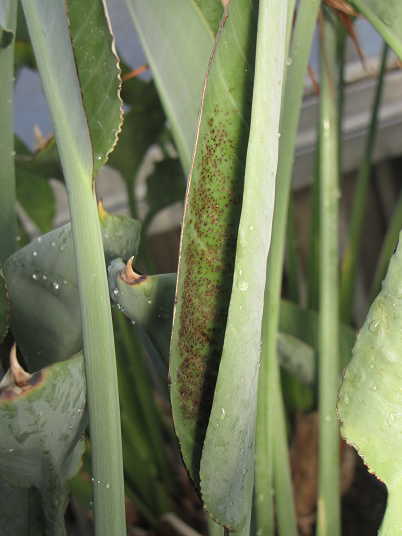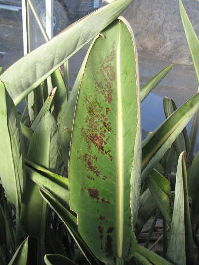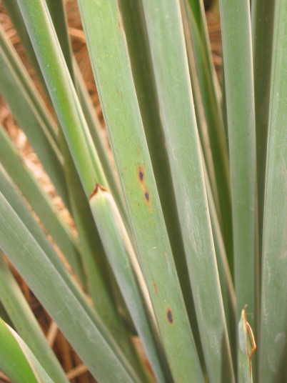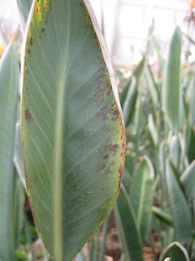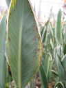 解説:(1)(2)は伸長展開後の葉(新しい葉ではない。)に現れた茶褐色の小斑点。発症範囲は葉身の半分以下で限定的。肥料過多としては軽症。