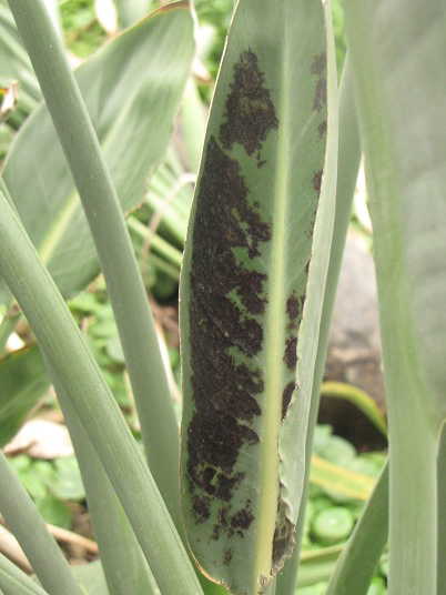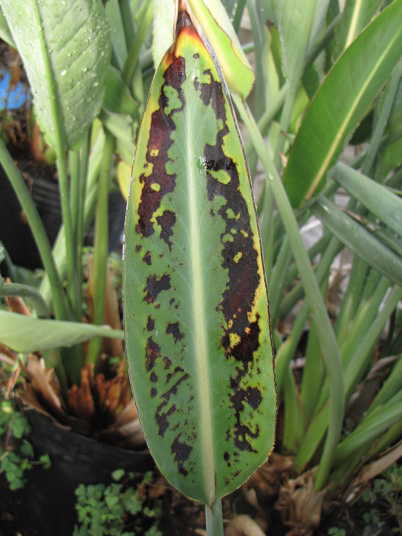 (3)(4)は伸長展開後の葉に現れた黒斑の数々。大きな黒~黒褐色の斑や葉身の広い範囲が黒っぽく変色することもある。同様の症状は他の葉にも見られ、肥料過多としては中から重症。