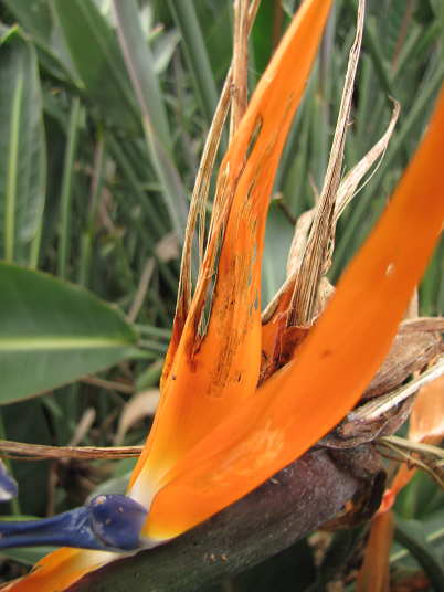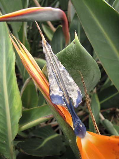 (2)は橙色レギネー種萼の食害です。食害は茶色に変色しているところと、萼が繊維状に透けて見えているところ、写真手前の萼の色が薄くなっているところ。これもかなり進行した状態。