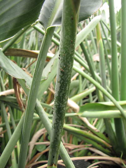 (5)これは(1)(2)の花茎で、害虫の這った跡が確認出来ます。これで一匹の大きさは小さいことが推測されます。ただ、数は多そうでそれで被害が大きくなったと思われます。