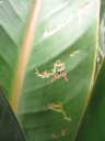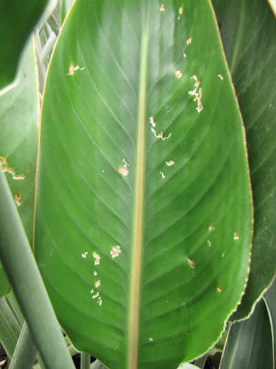 (3)これは(1)(2)株の新しい葉の食害跡です。ところどころ色の変わっているところが食害跡です。この害虫による被害としては大きい方です。