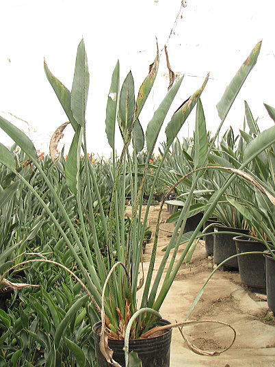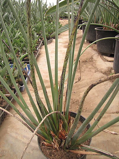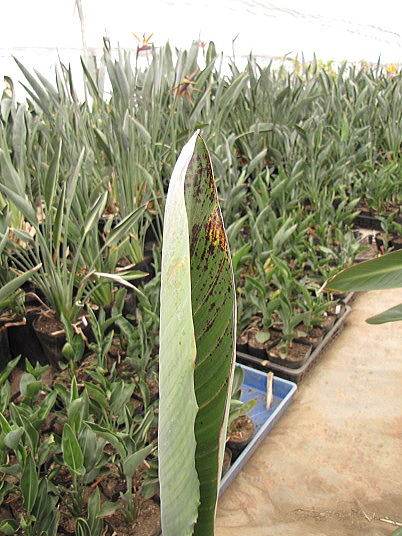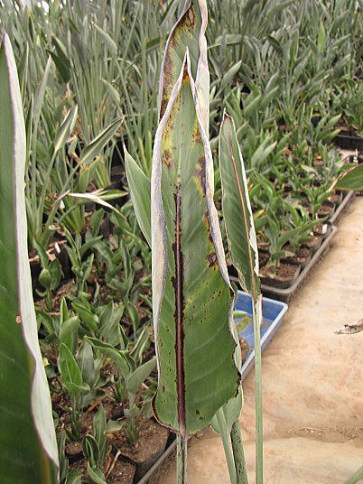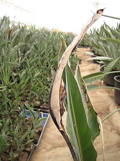 解説:実生1~2年生苗は多肥、多湿、乾燥、高温、低温等、開花株に比べてやや弱い面がある。上写真は2年生苗に現れた傷害を取り上げている。