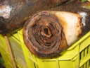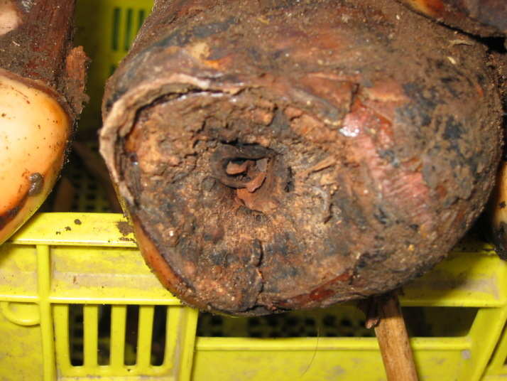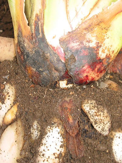 (3)この株は地植えレギネー開花株で6条立ち位の株を掘り上げたもの。食害によって、各芽はばらばらになっている。地上部(葉柄から上)と根を残しその中間部をほとんど食われてしまった。