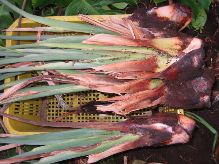 解説:(1)は地植えジャンセア開花株で被害の程度の軽い株。一番外側の葉の付け根付近の食害で葉が倒れ気味になっていた。ジャンセアは葉身が無いのでこの程度でも駆除しなければならない。