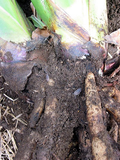 (2)はレギネー開花株を掘り上げたところ。葉の付け根のぎざぎざした感じの箇所が食害を受けたところ。根の上にいる灰色のわらじ形をした虫がわらじ虫。これ位であればそれほど悪影響は無いものの、駆除した方が良い。