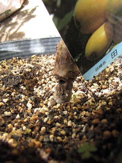 解説:写真は市販接ぎ木1年生びわの苗木で、21cmポットに植えてあります。