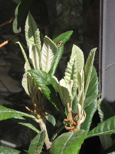 (2)(3)冬の間は室内へ取り込んでいて、4月から外に出して管理しています。暖冬だった影響もあり新芽が伸び始めています。