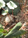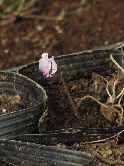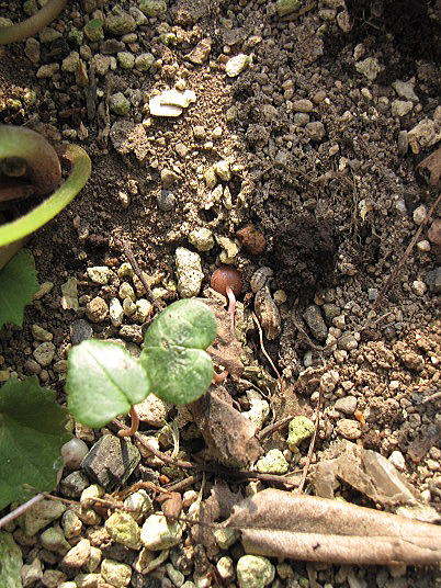 これは以前椿の苗を植えていたポットで、偶発実生によって原種シクラメンが生えてきたものです。原種シクラメンの種子がどの様にしてこのポット内に運ばれたのかは定かではありません。