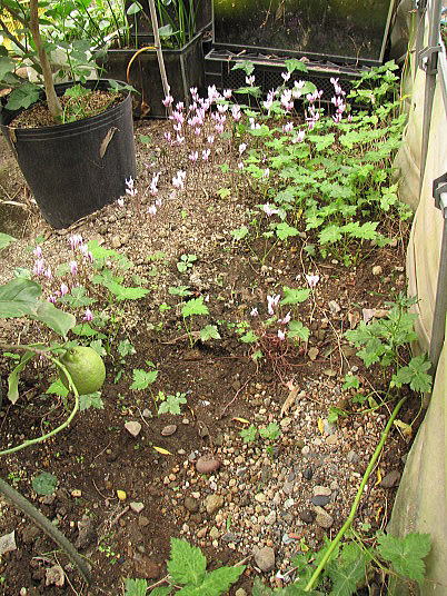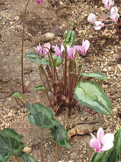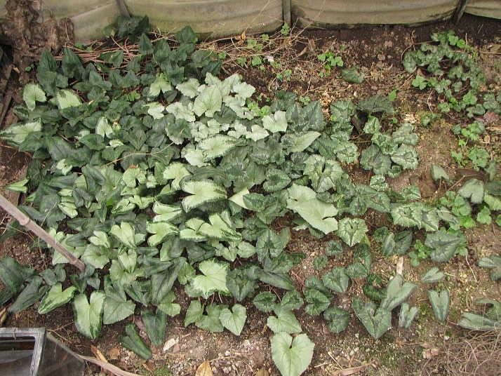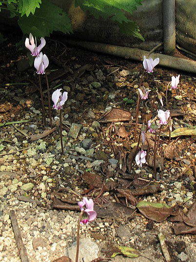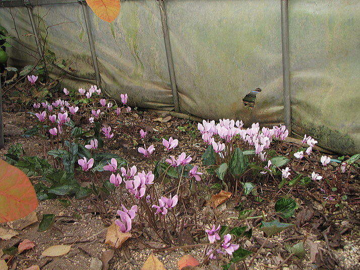 (2)~(4)「C.hederifolium」ヘデリフォリウム(以前はネアポリタナムと呼ばれていたもの)や「C.cilicium]シリシウム等です。こちらは地植えで、管理は鉢植えよりも手が掛かりません。