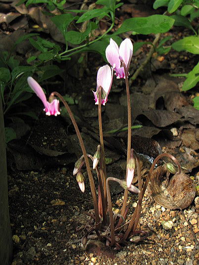 多くの原種シクラメンは秋か春開花が多くなり、主に冬場の花ですが、この種は夏咲きで、他種の開花の橋渡し役を担っています。