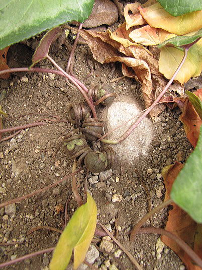 (3)早くに咲いた花はすでにコイル状に丸まって地際まで降りてきています。(4)また、早い株は葉が展開し始めました。これから冬の間光合成をして球根を太らせます。