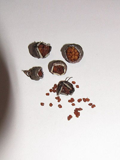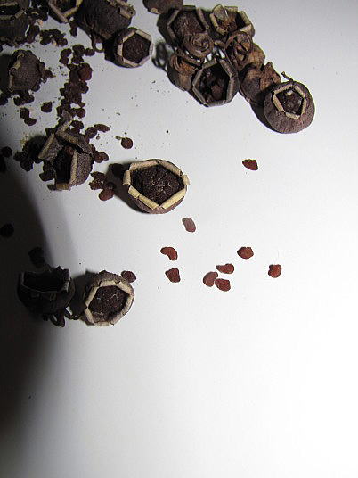 解説:(1)6月に収穫した種子は室内で乾燥させていました。(2)水分が抜けてだいぶ種子は小さくなりました。角張っていて、茶色から焦げ茶色の種子がたくさん取れた。