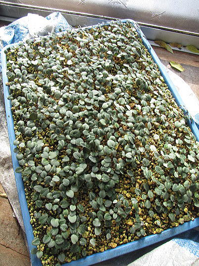 (2)実生苗の方はほぼ出揃いました。自然交雑種子なので葉の色、模様、形が変化に富んでいます。(3)播種時は細かいことを考えずに適当(いい加減に)に播いたのに、結構分散して発芽してきたことに驚いた。
