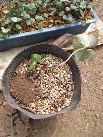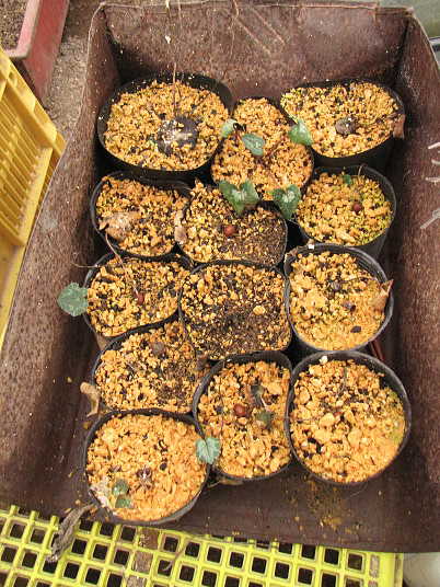 解説:昨年9月になって芽が動き出したので、鉢上げしました。鉢は9cmポリポットで、土はその辺にあったものです。