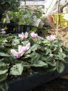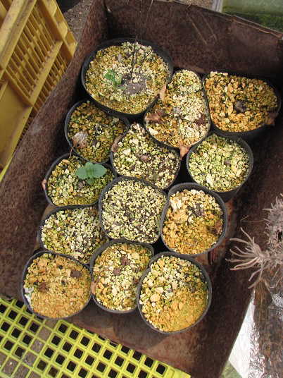 (3)こちらは昨年秋以降鉢上げして、無加温ハウス内で越冬させたものです。ハウス内とは言っても無加温では明け方外気と同じ気温にまで下がるので、真冬は凍結していましたが現在は溶けています。気になることは幾つかは枯れたものがあることです。