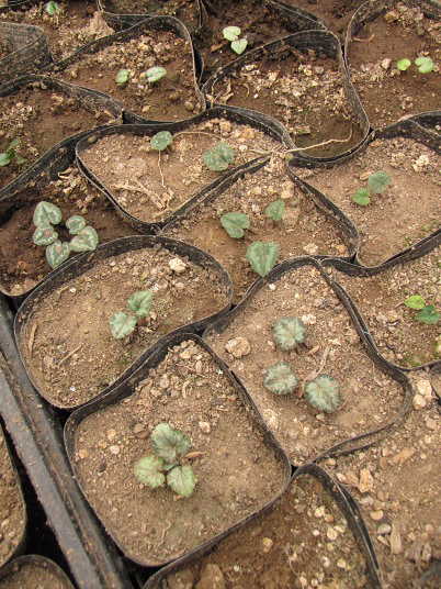 鉢植えシクラメンならばすぐに根腐れや球根腐敗を起こしそうな環境であるにもかかわらず、この原種シクラメンにとっては非常に良い環境とは言えないものの、葉を多く付けるには都合の良い条件なのかもしれない。