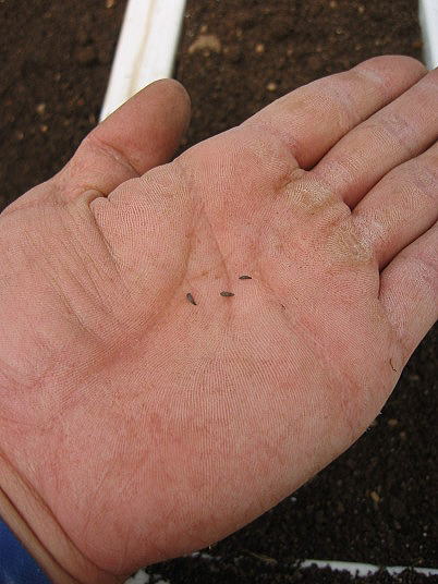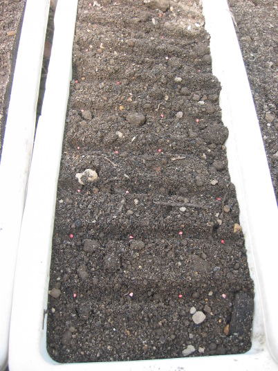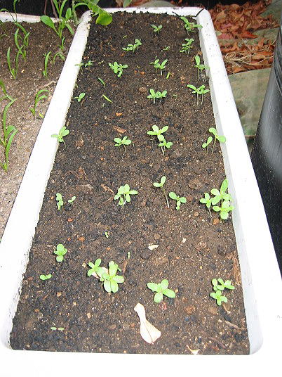 解説:(1)中央に1本育っているように見えますが、他のは害虫にやられたため、改めてまき直したのが手前の双葉です。本当はもう少し早く蒔けばよかったのです。