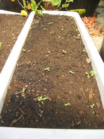 (3)春菊も本葉が出始めている。もう少し大きくなったら間引きを行う。