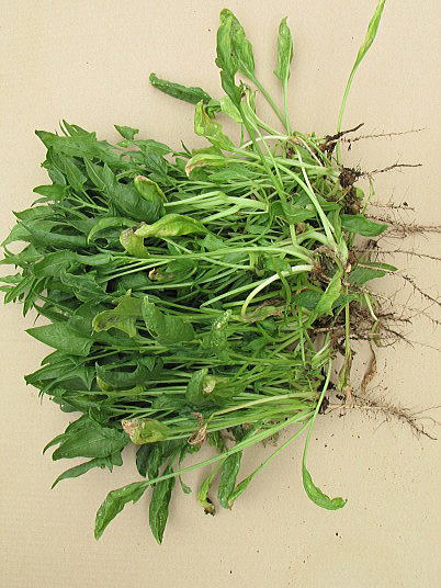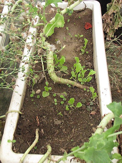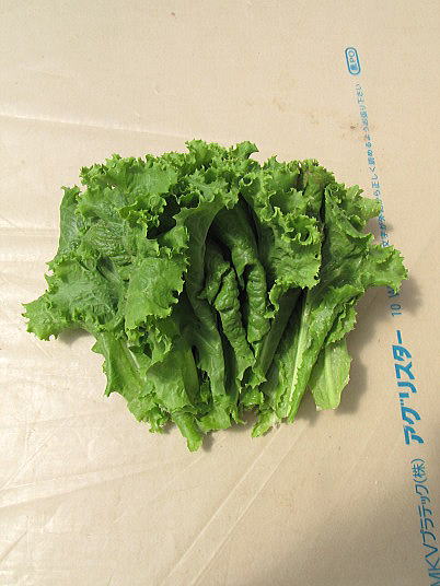 解説:(1)リーフレタスは猛暑の影響で薹立ちが早まった。春栽培では比較的長く収穫できたが、高温には勝てなかった。(2)その様な事情で傷んでいない葉はまとめて収穫した。たぶんこれで最後の収穫になろうかと思います。
