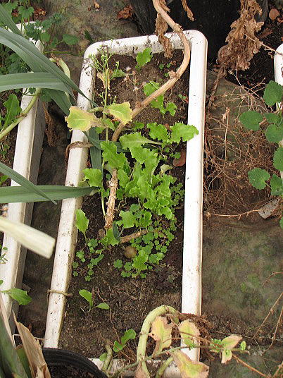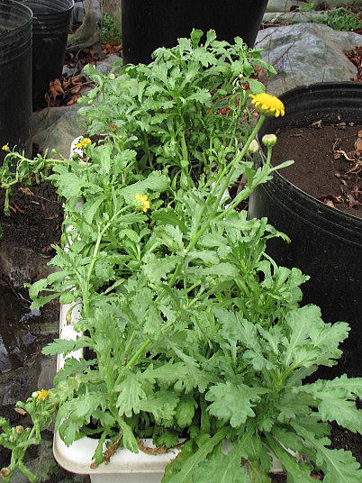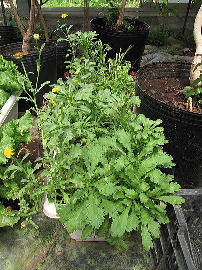 (3)(5)春菊は一時期の害虫被害を乗り越えて再び収穫することが出来た。(4)本当は花は咲かせずに摘み取らなければならないが、下手な花よりきれいと言えばきれい。春菊もレタスと同じように種子を採れば良いのですが、脇芽を伸ばして収穫することや、種子一袋が安価であることと、一袋当たりの種子量が多いことから、収穫に専念することとした。