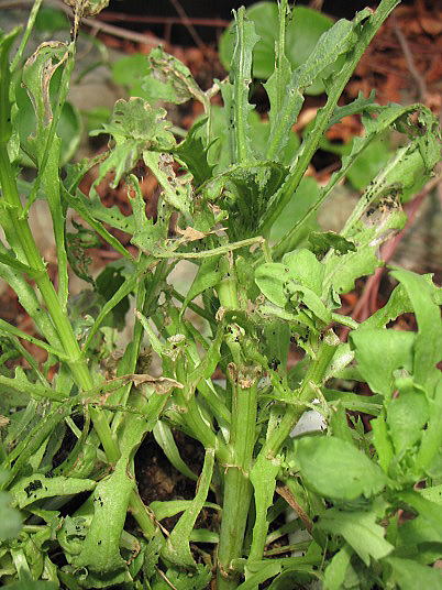 (3)~(6)春菊は比較的病害虫が少ないと言ってきましたが、ここへ来て害虫被害が目立ち始めた。これ位の虫であれば何らかの殺虫剤をかければすぐに駆除出来るのですが、自家消費用なので手で捕殺した。