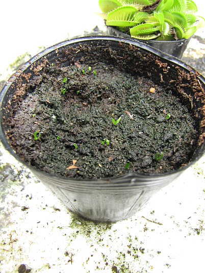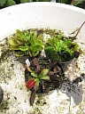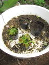 注意深く見てみると、一株モウセンゴケが生えてきました。(写真左上部)どの品種がこのポットへ入ったのか、花が咲くまで分かりません。