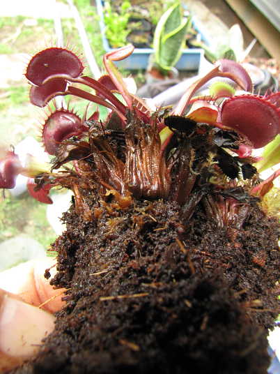 (2)鉢から抜いて見ると予想通り植え込み材料は腐敗が進んでいて、どぶの臭いが鼻を突いた。