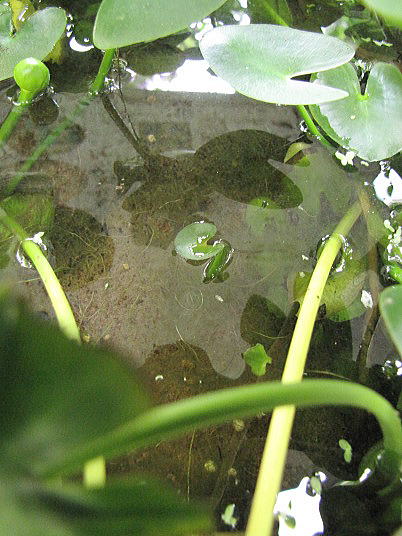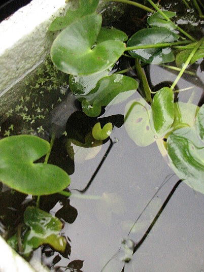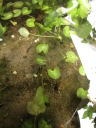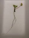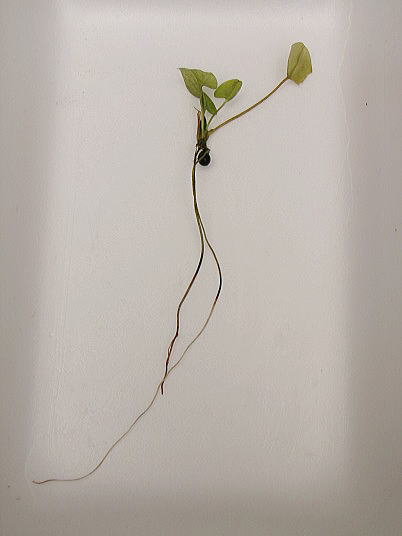 (2)(3)これは姫コウホネの自然交配、結実した種子からの実生の様子。葉の大きさは小指爪大。まだ株元には黒色の種子を付けている。根数は少ないものの長く伸長している。また、見かけの割には丈夫でちょっと引っ張った位では切れない。