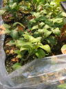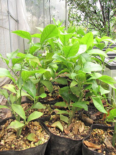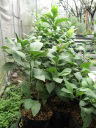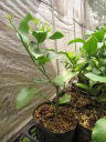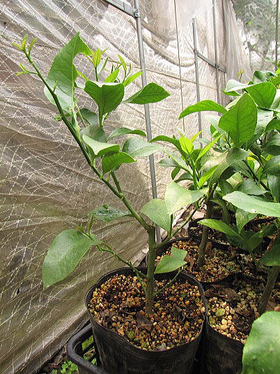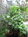 解説:春枝はほぼ伸びきって、葉が展開中。葉の大きさや色からもう少し肥料を効かせても良かった。その様な中、一つだけ花を付けた苗が見られた。もちろんこの大きさでは結実することは無い。