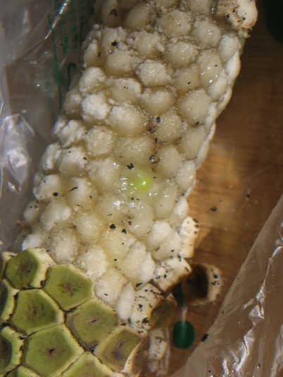 (2)少し果肉を取り除く。緑色の種子が確認出来る。