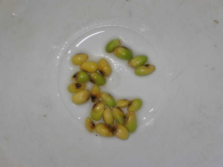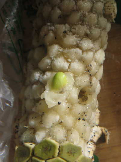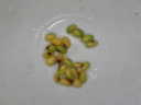 (4)取り出した種子。大きさは小さめの枝豆位。色は薄緑色。この果実一つから、計22粒の種子を取ることが出来ました。全く種子のない果実もあるので、これは非常に多く取れた方です。