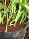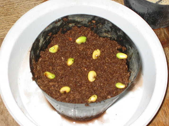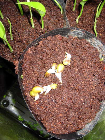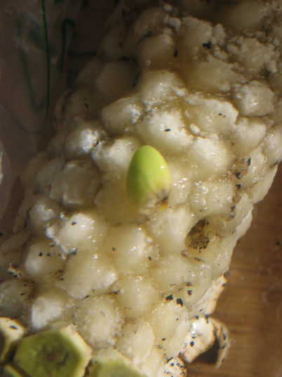 (3)は発芽初期の様子だが、果実から取り出した時にすでに根が伸びる箇所が膨らんでいる。よって、適当な条件下で間もなく発根を始め、やがて葉を伸ばす。