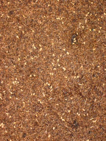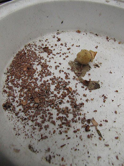 (2)一カ所に固まらないように播く。白っぽい粒が種子。