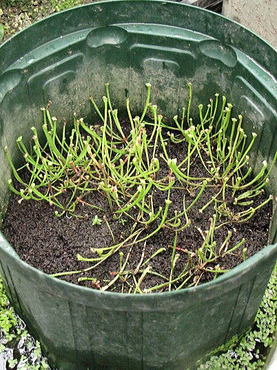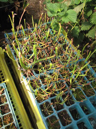 (12)は写真奥がプルプレアで、手前が直立系の小さなもの。数は合計で100ありました。よくこの狭い範囲で育っていたものです。それでもさすがにプルプレアは日照条件が悪かったらしく草姿は小さく根の伸びが悪かった。それで鉢上げ後、どこに植わっているのかよく分からない様な状況です。