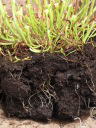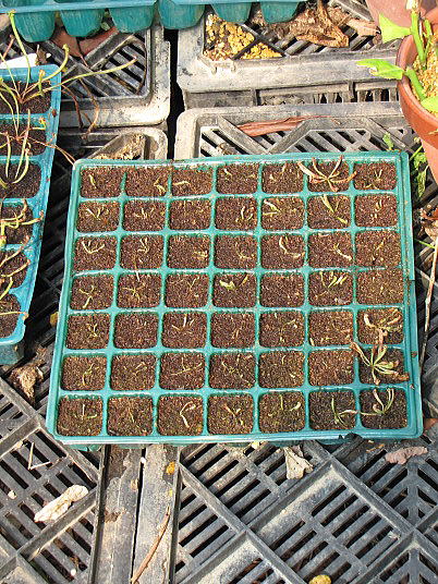 (8)~(10)植え方はとりあえず苗の位置を決めて周りに用土を詰め込んだ。もっと手っ取り早い方法としては、先にトレーに用土を隙間無く入れてから、細い棒で下穴を空けて根を入れて、高さを調整して用土を押さえて根と密着させると良い。(用土の空洞をなくす。)