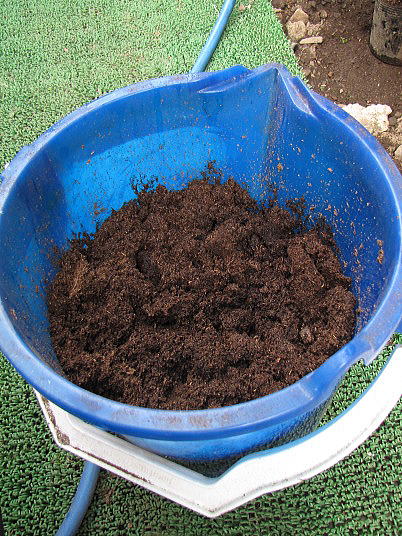 (6)鉢は、苗がまだ小さいのでトレーを使うことにしました。「セルトレー」だとか「プラグトレー」の名でいろいろな大きさのものが市販されています。このトレーは一辺が30~40(mm)位のものです。(7)用土はいつものピートモスです。一晩水に浸けてあります。